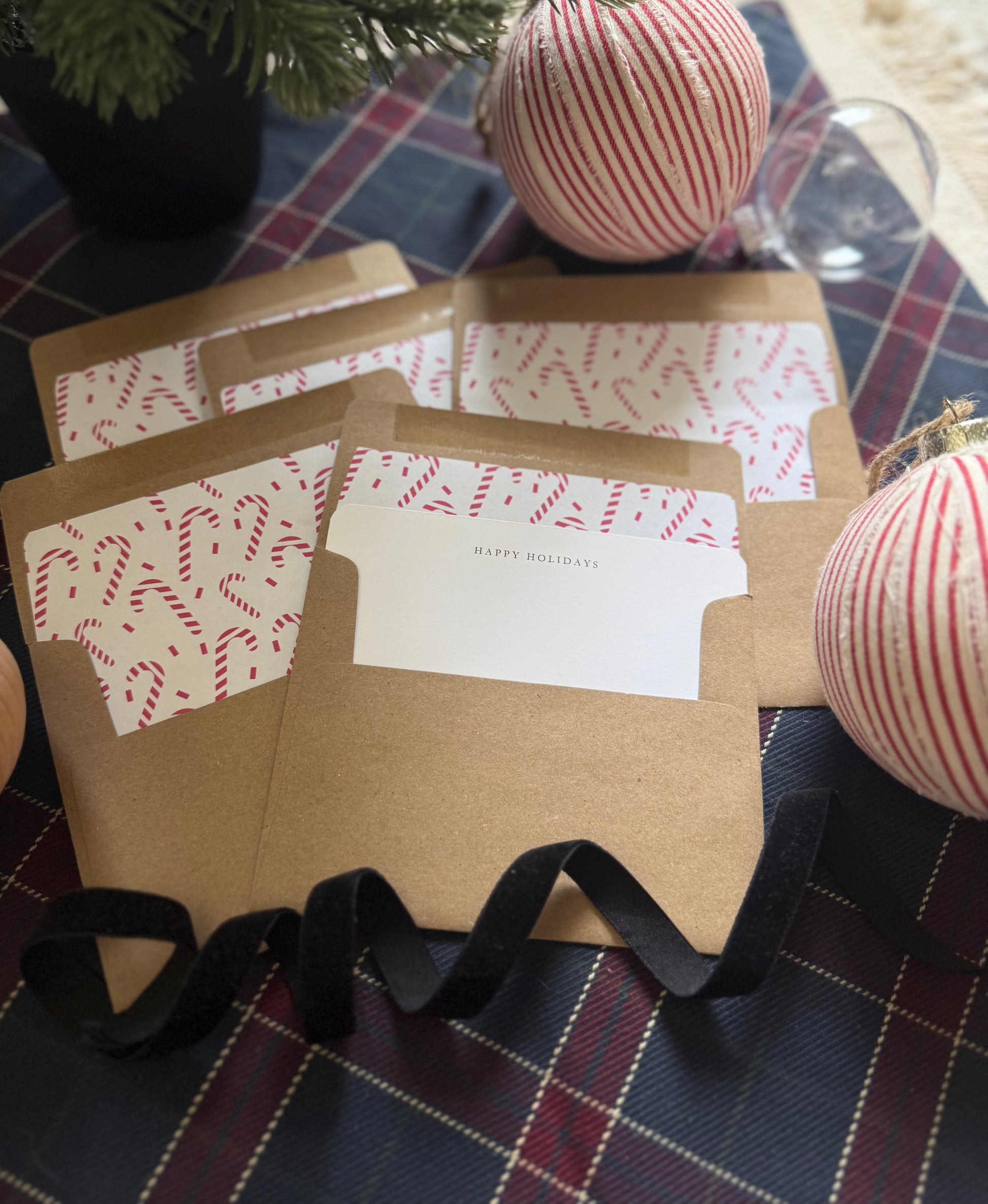 Spread seasonal joy with this festive red-and-white candy cane notecard set. Each A2 card pairs with a kraft envelope lined in a matching red-striped interior—an instant upgrade to holiday mailings. Great for personal holiday greetings, gifting, and seasonal thank-yous.